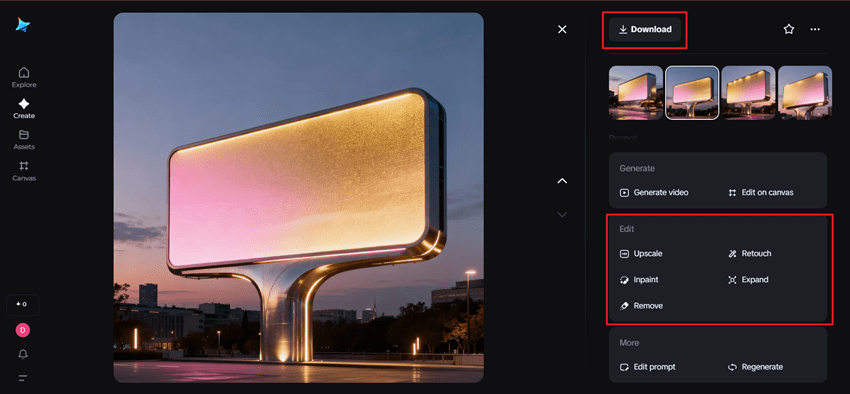 There are advanced tools that require refining tools and customization to examine the image to create the best display for your billboard attraction. You may wish to try inpaint to change small aspects, expand to visualize a background setting with ambience, remove to trim paths’ unnecessary aspects of the visual, and retouch for a finished look. Finally, when your adaptive billboard is ready to awaken emotional responses in the city with your visual work, click Download and the visually attractive way to share your work anytime.