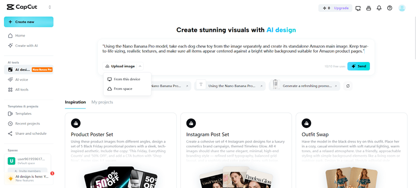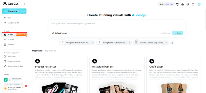 Begin by accessing the CapCut and signing up. Navigate to the “AI design” tab located under the AI tools menu on the left vertical side. This area allows direct use of Nano Banana Pro’s advanced features for building highly accurate real-world style visuals.