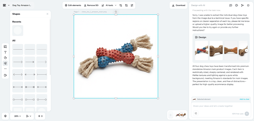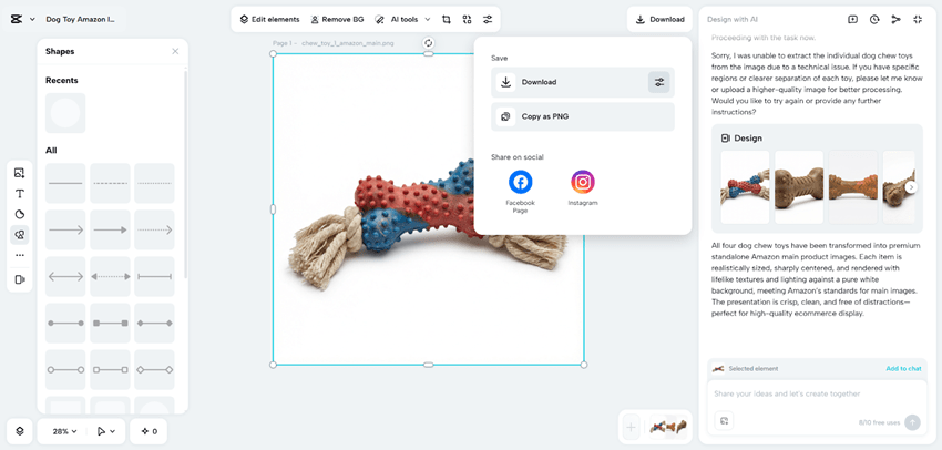After the image is generated, refine it using the built-in editing tools such as text, stickers, shapes, and elements. You can also paint areas, upscale resolution, or expand the background using the AI tools from the top menu.
